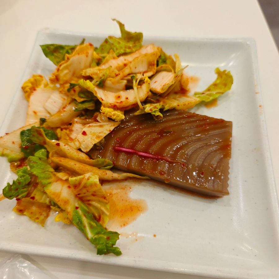 기본 반찬으로는 파채무침, 상추재래기, 튀김, 백김치, 도토리묵 겉절이, 샐러드, 그리고 떡볶이가 나왔어요