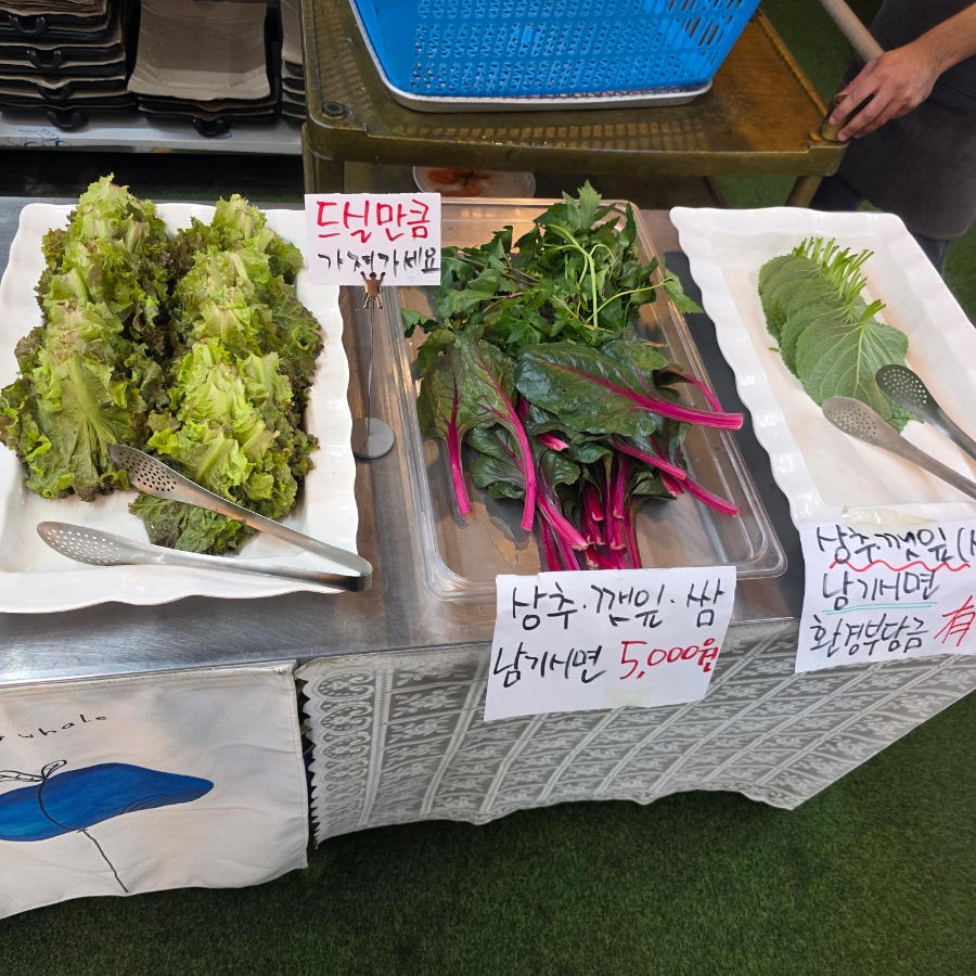 깔끔하게 정돈된 반찬 코너와 각종 나물, 김치, 장아찌, 샐러드 등도 있었어요