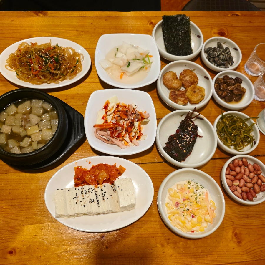 소고기무국, 두부김치, 잡채, 오징어무침, 콘샐러드, 백김치, 동그랑땡, 김, 깻잎무침, 고동, 번데기, 땅콩까지