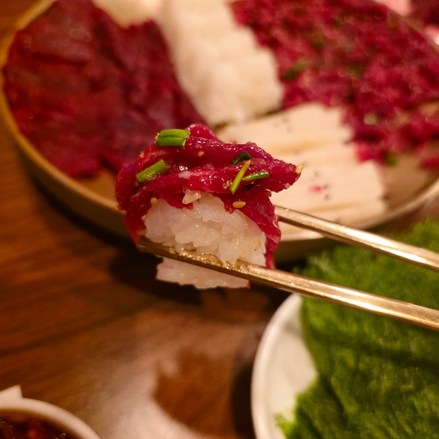 뭉티기를 감태에 싸서 먹기도 하고 육회를 초밥용 밥 위에 올려서 먹었더니