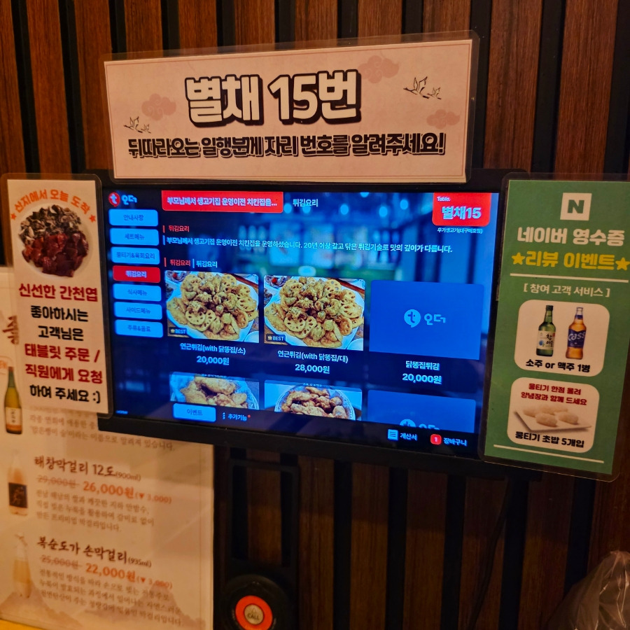 뭉티기와 육회 외에도 연근튀김, 후라이드치킨, 간장치킨 같은 안주 메뉴들도 있었어요