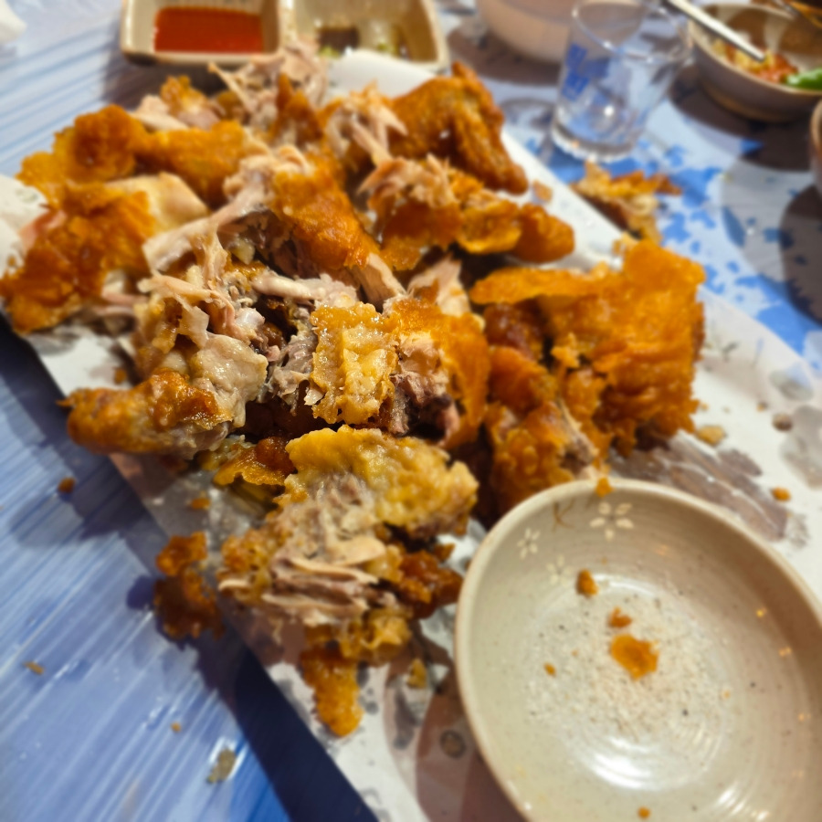 먹다 보니까 서비스로 옛날 통닭까지 나와서 테이블이 더 풍성해졌답니다