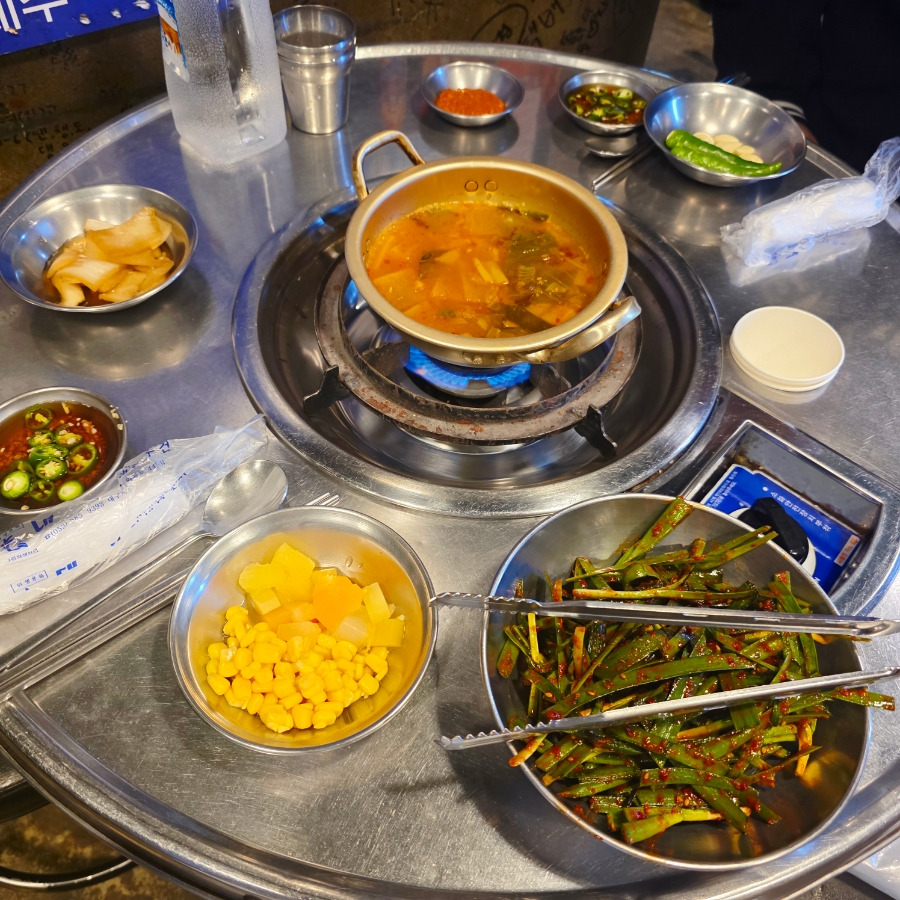 기본 세팅으로는 양파장, 고기 소스, 옥수수와 파인애플, 부추무침, 마늘, 고추, 쌈장 그리고 얼큰한 소고기국이 먼저 나오는데