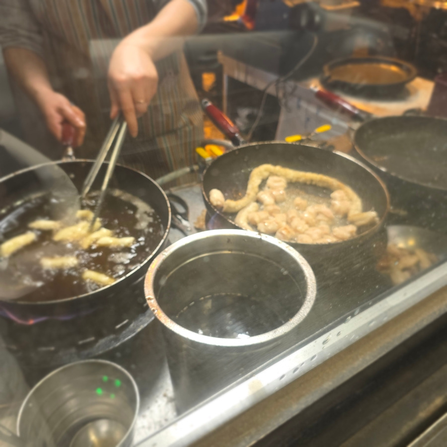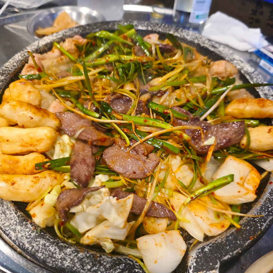 바삭하게 튀겨진 떡 튀김이랑 염통부터 먼저 먹고 있으면 직원분이 다시 돌판을 한 번 더 뒤집어서 구워주시는데