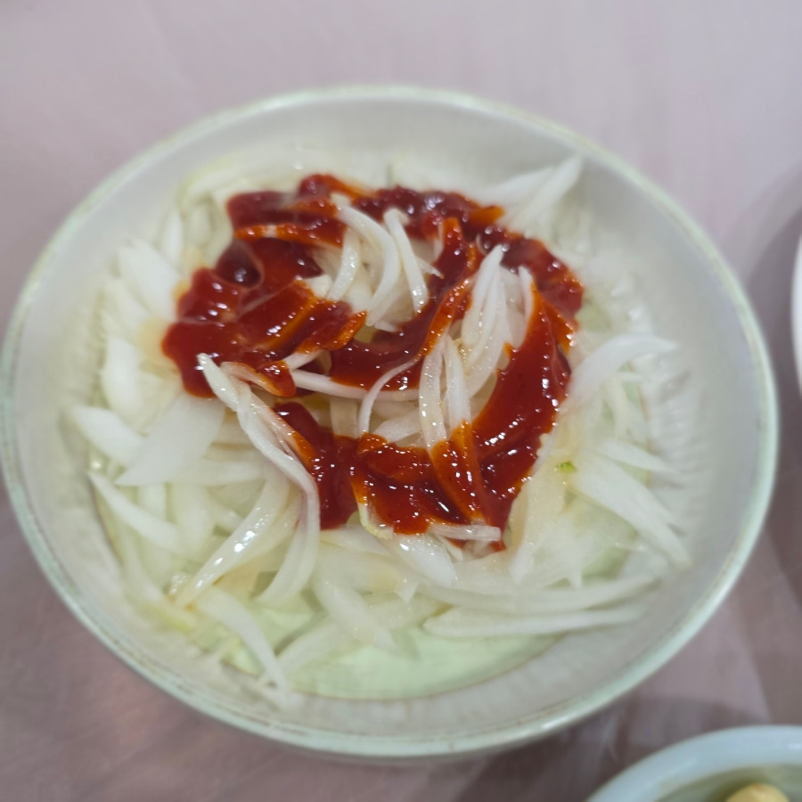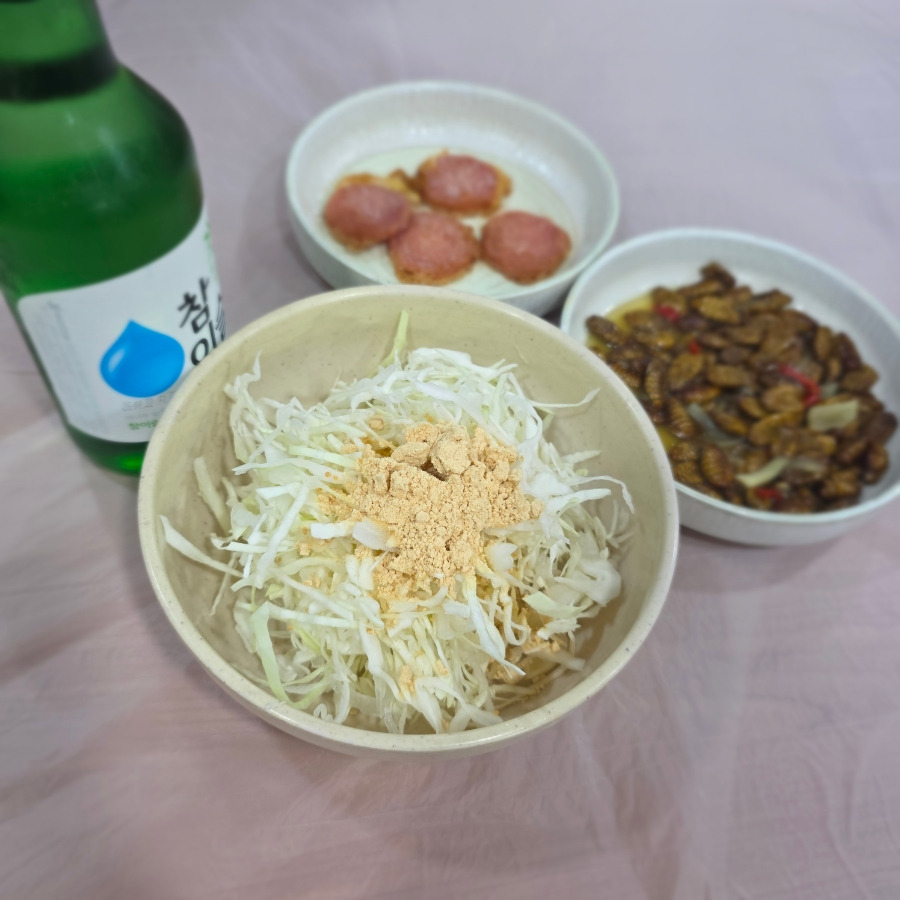 기본찬으로 콩가루가 뿌려진 양배추채와 번데기, 분홍소세지와 양파전이 나왔어요