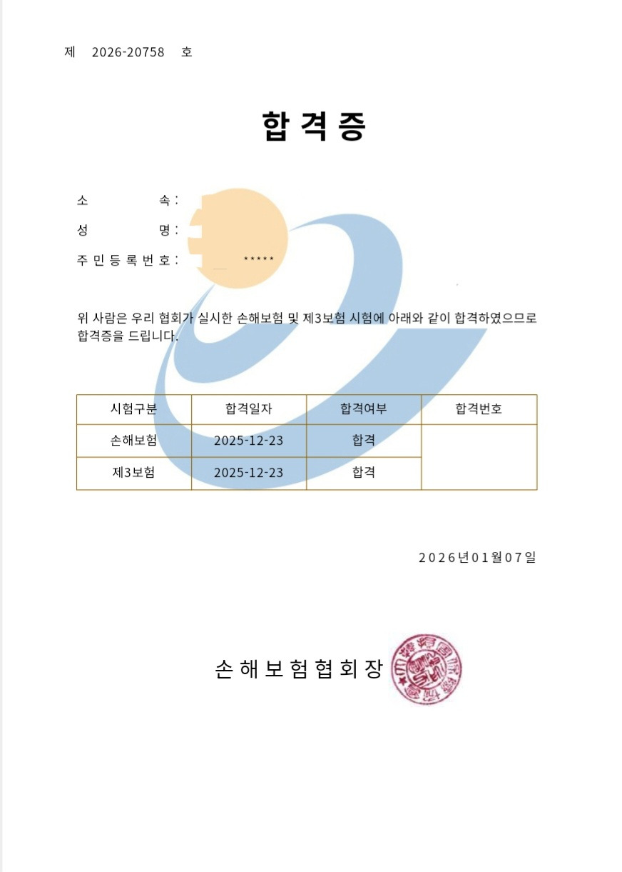 소속 보험사에서 “합격하셨어요”