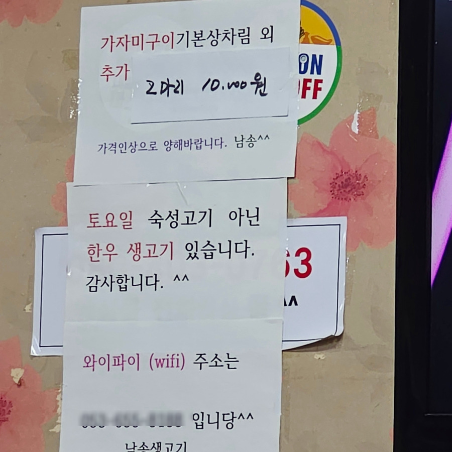 남송생고기는 송현제림타운 아파트 근처에 위치하고 있고 전용 주차장은 따로 없답니다