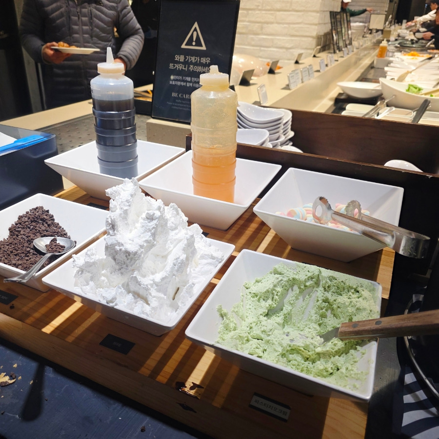 아이들이 특히 좋아할 만한 초코 퐁듀, 와플, 요거트 코너가 제일 먼저 눈에 띄었고