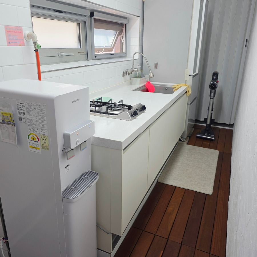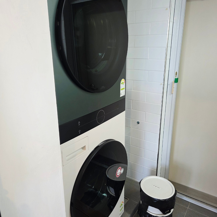 뒷베란다에는 세탁기와 건조기까지 준비되어 있어서 장기 숙박해도 전혀 문제없을 것 같았어요