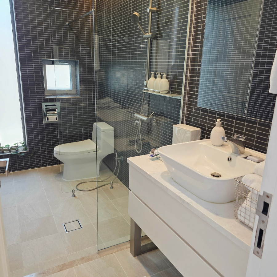 화장실은 1층과 2층에 각각 하나씩 있었고 샴푸 린스 바디워시 수건 드라이기까지 다 준비되어 있었어요