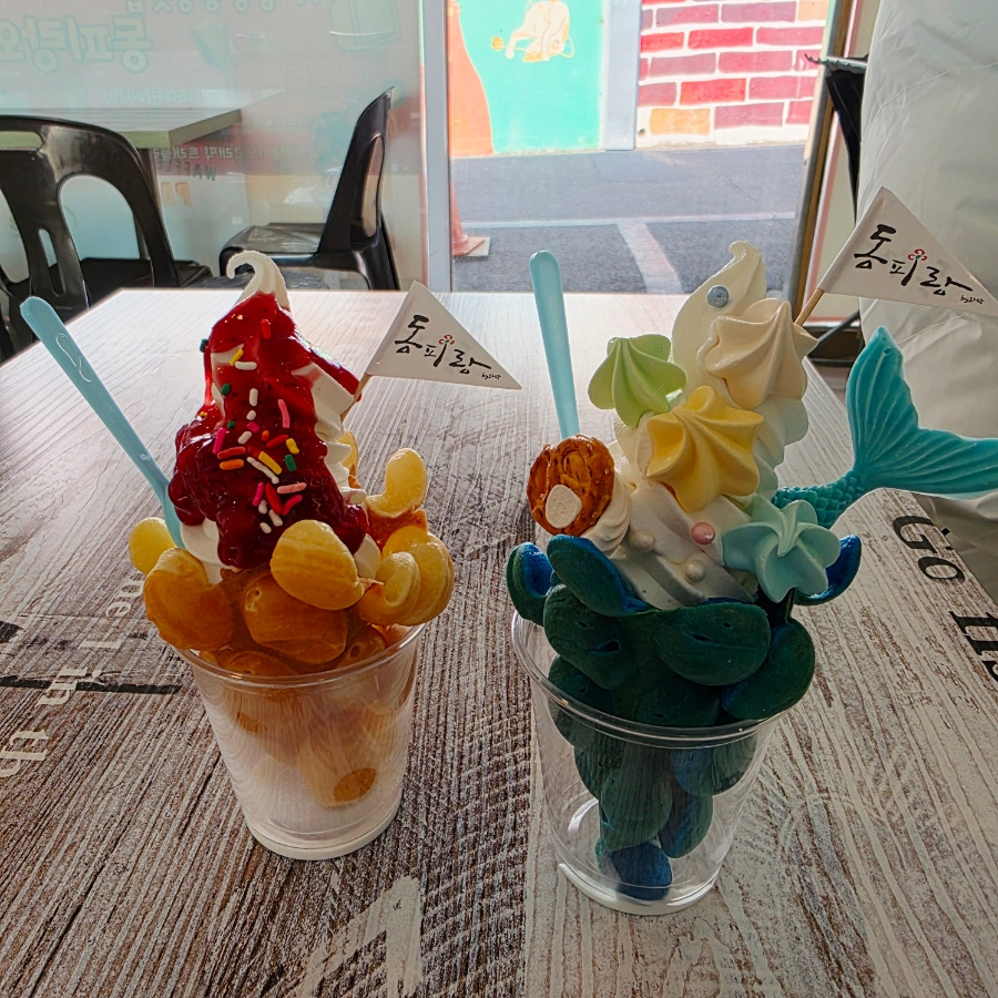 머랭 쿠키로 만든 인어 꼬리가 위에 딱 올라가 있어서 감성 제대로였고 아이스크림은 우유 맛이라서 부드럽고 고소했는데