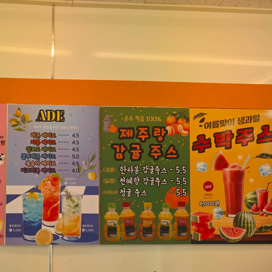 기다리는 동안 메뉴판을 보다 보니까 제주랑 감귤 주스가 눈에 띄더라고요
